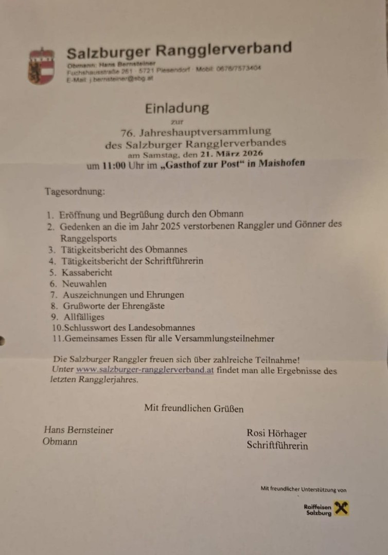 Am 21. März 2026 um 11.00 Uhr findet in Maishofen im "Gasthof zur Post" die JHV des Salzburger Rangglerverbandes statt. Dabei wird es bei den Neuwahlen einige Änderungen geben und es werden auch wichtige Weichen für die Zukunft gestellt.